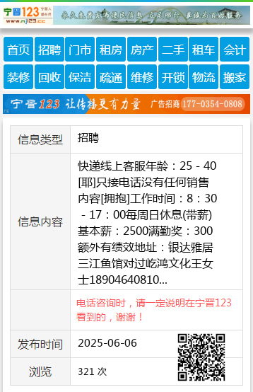 快递线上客服年龄:25-40[耶]只接电话没有任何销售内容[拥抱]工作时间:8:30-17:00每周日休息(带薪)基本薪:2500满勤奖:300额外有绩效地址:银达雅居三江鱼馆对过屹鸿文化王女士18904640810 【电话咨询时,请一定说明在七台河信息网看到的,谢谢!】 |