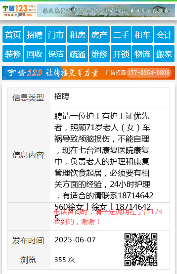 聘请一位护工有护工证优先者,照顾71岁老人(女)车祸导致颅脑损伤,不能自理,现在七台河康复医院康复中,负责老人的护理和康复管理饮食起居,必须要有相关方面的经验,24小时护理,有适合的请联系18714642560徐女士徐女士18714642560 【电话咨询时,请一定说明在七台河信息网看到的,谢谢!】 |