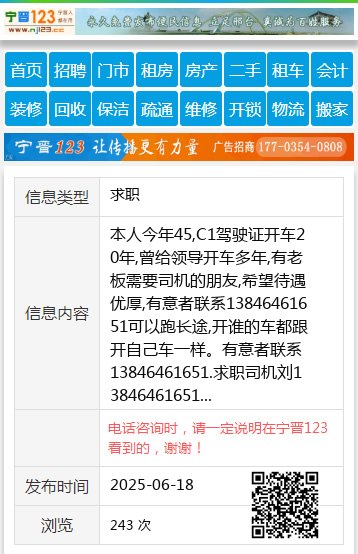 本人今年45,C1驾驶证开车20年,曾给领导开车多年,有老板需要司机的朋友,希望待遇优厚,有意者联系13846461651可以跑长途,开谁的车都跟开自己车一样。有意者联系13846461651.求职司机刘13846461651