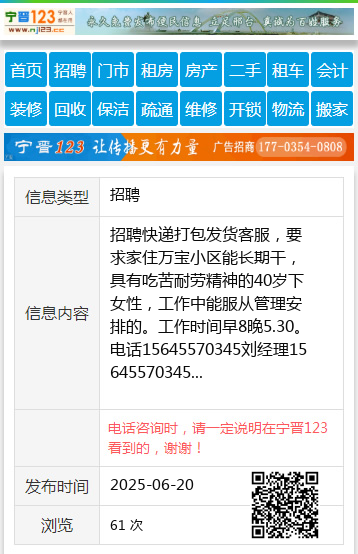 招聘快递打包发货客服,要求家住万宝小区能长期干,具有吃苦耐劳精神的40岁下女性,工作中能服从管理安排的。工作时间早8晚5.30。电话15645570345刘经理15645570345 【电话咨询时,请一定说明在七台河信息网看到的,谢谢!】 |