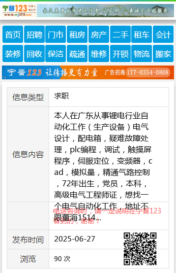 本人在广东从事锂电行业自动化工作(生产设备)电气设计,配电箱,疑难故障处理,plc编程,调试,触摸屏程序,伺服定位,变频器,cad,模拟量,精通气路控制,72年出生,党员,本科,高级电气工程师证,想找一个电气自动化工作,地址不限董海15146498508 【电话咨询时,请一定说明在七台河信息网看到的,谢谢!】 |