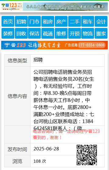 公司招聘电话销售业务员招聘电话销售业务员20名(女生),有无经验均可。工作时间:早8.30-晚5点每周日带薪休息每天工作8小时,中午休息一小时。底薪2800+满勤200+业绩提成地址:七台河桃山区联系电话:13846424581联系人:(微信同号)赵13846424581 【电话咨询时,请一定说明在七台河信息网看到的,谢谢!】 |