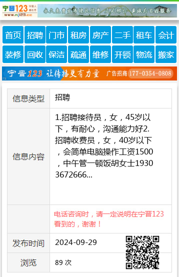 1.招聘接待员,女,45岁以下,有耐心,沟通能力好2.招聘收费员,女,40岁以下,会简单电脑操作工资1500,中午管一顿饭胡女士19303672666 【电话咨询时,请一定说明在七台河信息网看到的,谢谢!】 |