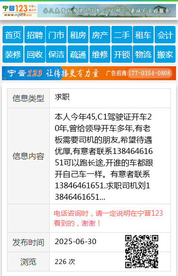 本人今年45,C1驾驶证开车20年,曾给领导开车多年,有老板需要司机的朋友,希望待遇优厚,有意者联系13846461651可以跑长途,开谁的车都跟开自己车一样。有意者联系13846461651.求职司机刘13846461651 【电话咨询时,请一定说明在七台河信息网看到的,谢谢!】 |