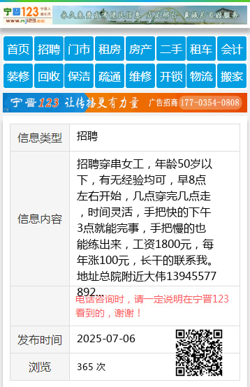 招聘穿串女工,年龄50岁以下,有无经验均可,早8点左右开始,几点穿完几点走,时间灵活,手把快的下午3点就能完事,手把慢的也能练出来,工资1800元,每年涨100元,长干的联系我。地址总院附近大伟13945577892 【电话咨询时,请一定说明在七台河信息网看到的,谢谢!】 |