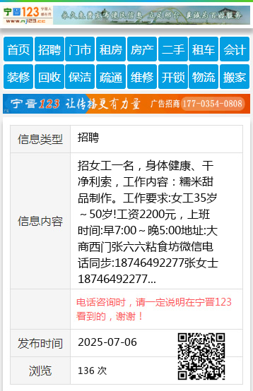 招女工一名,身体健康、干净利索,工作内容:糯米甜品制作。工作要求:女工35岁~50岁!工资2200元,上班时间:早7:00~晚5:00地址:大商西门张六六粘食坊微信电话同步:18746492277张女士18746492277 【电话咨询时,请一定说明在七台河信息网看到的,谢谢!】 |