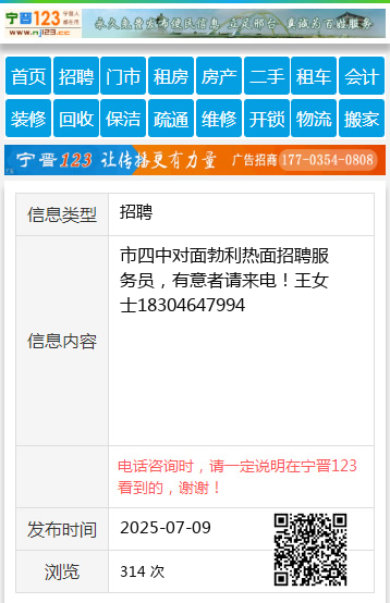 市四中对面勃利热面招聘服务员,有意者请来电!王女士18304647994