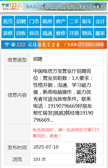 中国电信万宝营业厅招聘岗位:营业员职数:1人要求:性格开朗,沟通、学习能力强,熟悉电脑操作,能力优秀者可适当放宽条件。联系电话:19190796669好朋友帮忙转发[跳跳]韩经理19190796669 【电话咨询时,请一定说明在七台河信息网看到的,谢谢!】 |