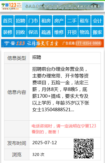 招聘前台办理业务营业员,主要办理宽带、开卡等等资费项目,五险一金,法定三薪,月休8天,早8晚5,底薪1700+提成,要求大专及以上学历,年龄35岁以下张女士13504888521 【电话咨询时,请一定说明在七台河信息网看到的,谢谢!】 |