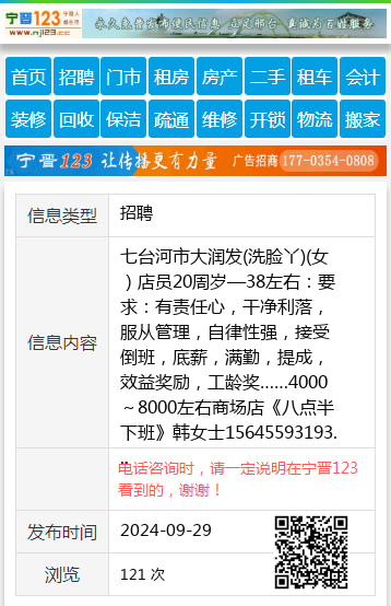 七台河市大润发(洗脸丫)(女)店员20周岁—38左右:要求:有责任心,干净利落,服从管理,自律性强,接受倒班,底薪,满勤,提成,效益奖励,工龄奖……4000~8000左右商场店《八点半下班》韩女士15645593193 【电话咨询时,请一定说明在七台河信息网看到的,谢谢!】 |