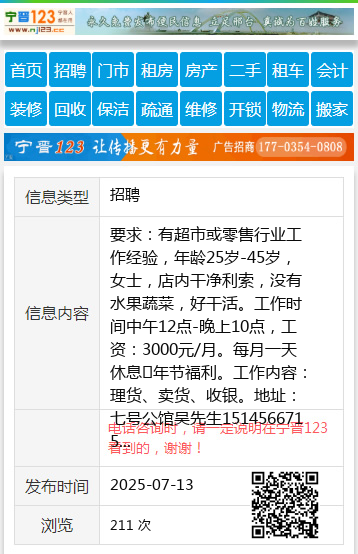 要求:有超市或零售行业工作经验,年龄25岁-45岁,女士,店内干净利索,没有水果蔬菜,好干活。工作时间中午12点-晚上10点,工资:3000元/月。每月一天休息➕年节福利。工作内容:理货、卖货、收银。地址:七号公馆吴先生15145667151 【电话咨询时,请一定说明在七台河信息网看到的,谢谢!】 |