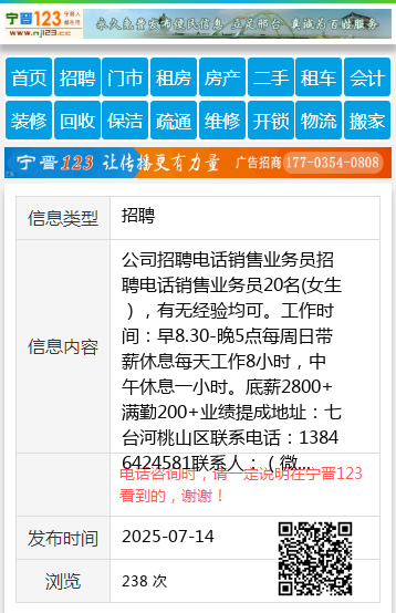 公司招聘电话销售业务员招聘电话销售业务员20名(女生),有无经验均可。工作时间:早8.30-晚5点每周日带薪休息每天工作8小时,中午休息一小时。底薪2800+满勤200+业绩提成地址:七台河桃山区联系电话:13846424581联系人:(微信同号)赵女士13846424581 【电话咨询时,请一定说明在七台河信息网看到的,谢谢!】 |