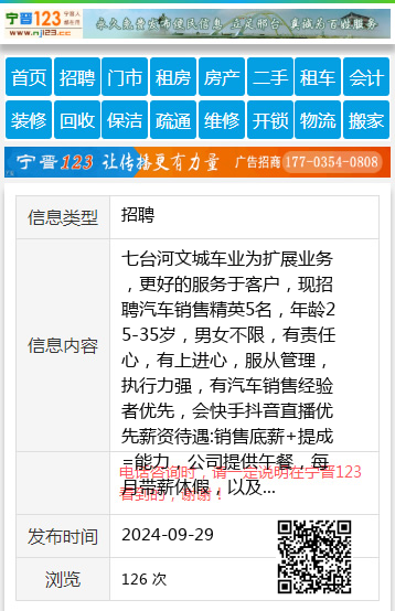 七台河文城车业为扩展业务,更好的服务于客户,现招聘汽车销售精英5名,年龄25-35岁,男女不限,有责任心,有上进心,服从管理,执行力强,有汽车销售经验者优先,会快手抖音直播优先薪资待遇:销售底薪+提成=能力,公司提供午餐,每月带薪休假,以及年终福利奖等等同时诚招信息员,中介,你负提供车辆信息,我负责成交,茶水500起,上不封顶联系电话18846466655地址:桃山区大明街泰吉鸿物流旁(原光大汽修)王先生18846466655 【电话咨询时,请一定说明在七台河信息网看到的,谢谢!】 |