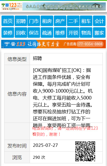 [OK]国有煤矿招工[OK]:掘进工作面条件优越,安全有保障。每月完成矿内计划可收入9000-10000元以上。机电、大修工每月能收入5000元以上。享受五险一金待遇。想要瓦检员抽放打钻工作的还可在掘进加班,可为下一趟井,享受两份工资一举两得。家在北山、七星花园、北岸居住的早晚三个班次都有通勤车接送。马场居住在开发区道口有通勤车。每人入井有《四样保健班中餐》,每个人享受《生日蛋糕、洗工作服》,让工人上班安心暖心。入井坐罐笼,平巷坐斜井人车三班次接送。《57周岁均可办理,体检费30元合格后,10日內均可到工作岗位上班》。国企春节放3-5天假,不压工资,有意者抓紧前来报名,电话微信同步13704570630王女士13704570630 【电话咨询时,请一定说明在七台河信息网看到的,谢谢!】 |