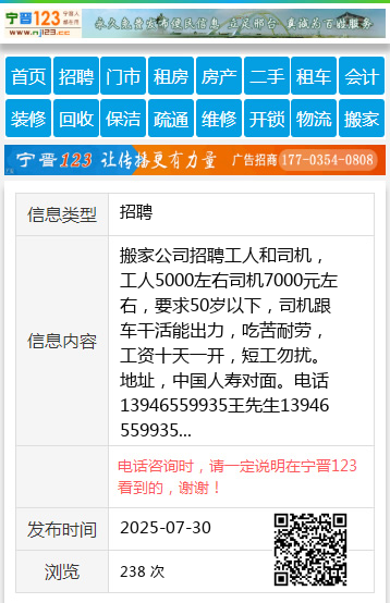搬家公司招聘工人和司机,工人5000左右司机7000元左右,要求50岁以下,司机跟车干活能出力,吃苦耐劳,工资十天一开,短工勿扰。地址,中国人寿对面。电话13946559935王先生13946559935 【电话咨询时,请一定说明在七台河信息网看到的,谢谢!】 |