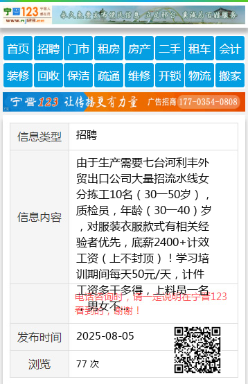 由于生产需要七台河利丰外贸出口公司大量招流水线女分拣工10名(30一50岁),质检员,年龄(30一40)岁,对服装衣服款式有相关经验者优先,底薪2400+计效工资(上不封顶)!学习培训期间每天50元/天,计件工资多干多得,上料员一名,男女不限,(50一55)早7:30一16:30中午管饭!以上只招长期工,短工勿扰!厂址:新兴区宝泰隆路26号,1路公交车(走葫芦头沟)家居广场站点前走100米恒阳科技公司红大门院内。☎️13946506087王总13946506087 |