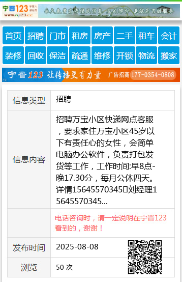 招聘万宝小区快递网点客服,要求家住万宝小区45岁以下有责任心的女性,会简单电脑办公软件,负责打包发货等工作,工作时间:早8点-晚17.30分,每月公休四天。详情15645570345刘经理15645570345 【电话咨询时,请一定说明在七台河信息网看到的,谢谢!】 |