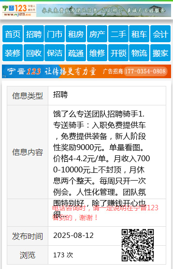 饿了么专送团队招聘骑手1.专送骑手:入职免费提供车,免费提供装备,新人阶段性奖励9000元。单量看图。价格4-4.2元/单。月收入7000-10000元上不封顶,月休息两个整天。每周只开一次例会。人性化管理。团队氛围特别好,除了赚钱开心也很重要。2.兼职骑手:时间自由安排。月收入不想赚3000-5000的你就别来了3.众包骑手:无任何要求,无例会,无团队约束,每天完成5单即可。想赚钱的跑单无上限。月收入2000-4000元。上班族,时间少的不错的选择。详情咨询:18746402070(微信同步)单单18746402070 【电话咨询时,请一定说明在七台河信息网看到的,谢谢!】 |