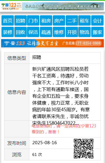 新兴矿通风区招聘瓦检员若干名工资高,待遇好,劳动强度不大,工作时长八小时,上下班有通勤车接送,国有企业扣五险一金,要求身体健康,视力正常,无职业病的年龄30至45周岁。有意者请联系宋先生,非诚勿扰宋先生15804647022 【电话咨询时,请一定说明在七台河信息网看到的,谢谢!】 |