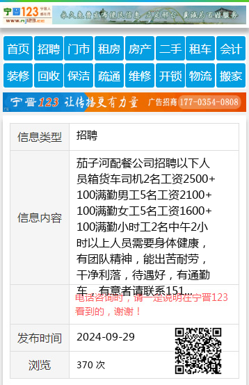 茄子河配餐公司招聘以下人员箱货车司机2名工资2500+100满勤男工5名工资2100+100满勤女工5名工资1600+100满勤小时工2名中午2小时以上人员需要身体健康,有团队精神,能出苦耐劳,干净利落,待遇好,有通勤车,有意者请联系15184613338李女士李女士15184613338 【电话咨询时,请一定说明在七台河信息网看到的,谢谢!】 |